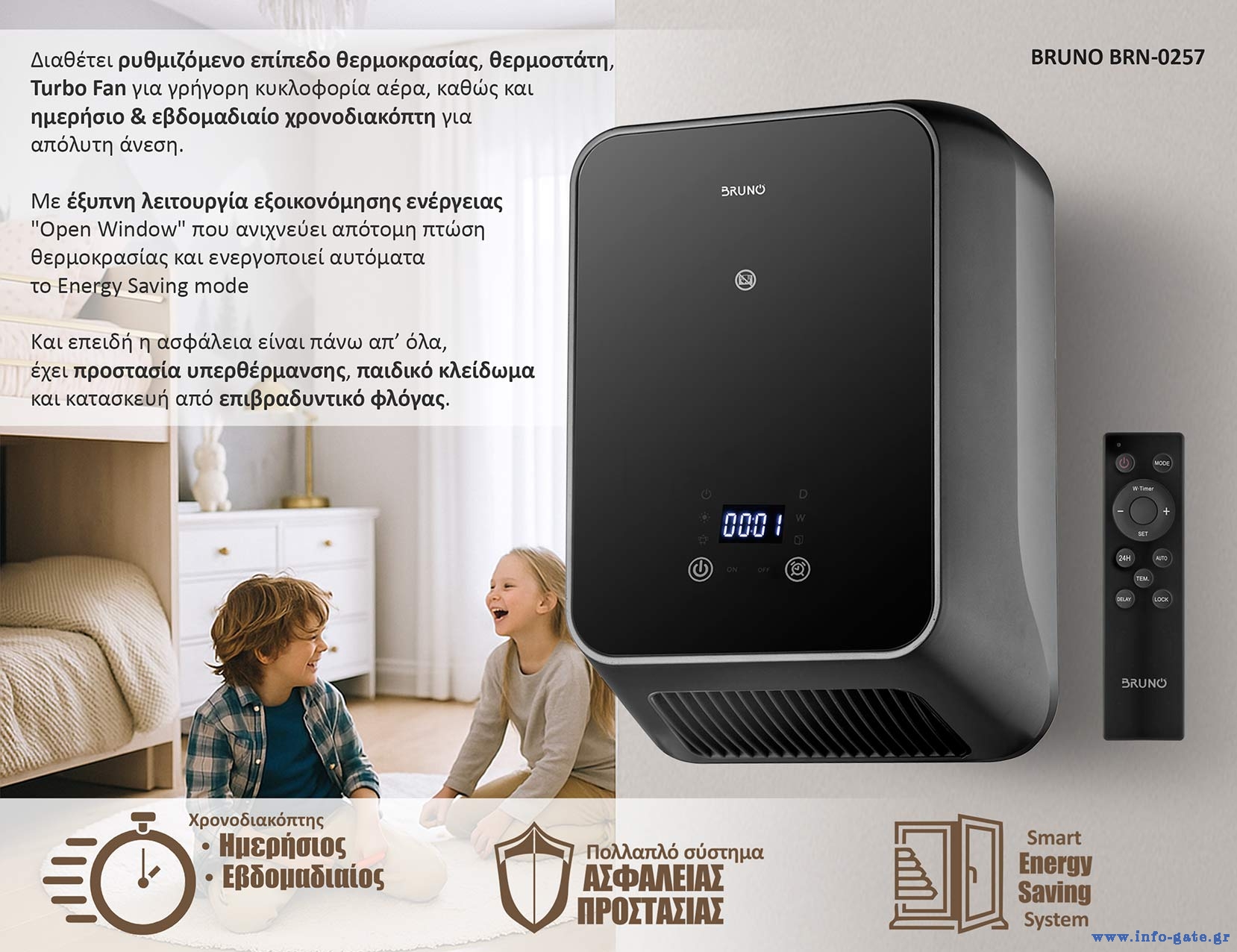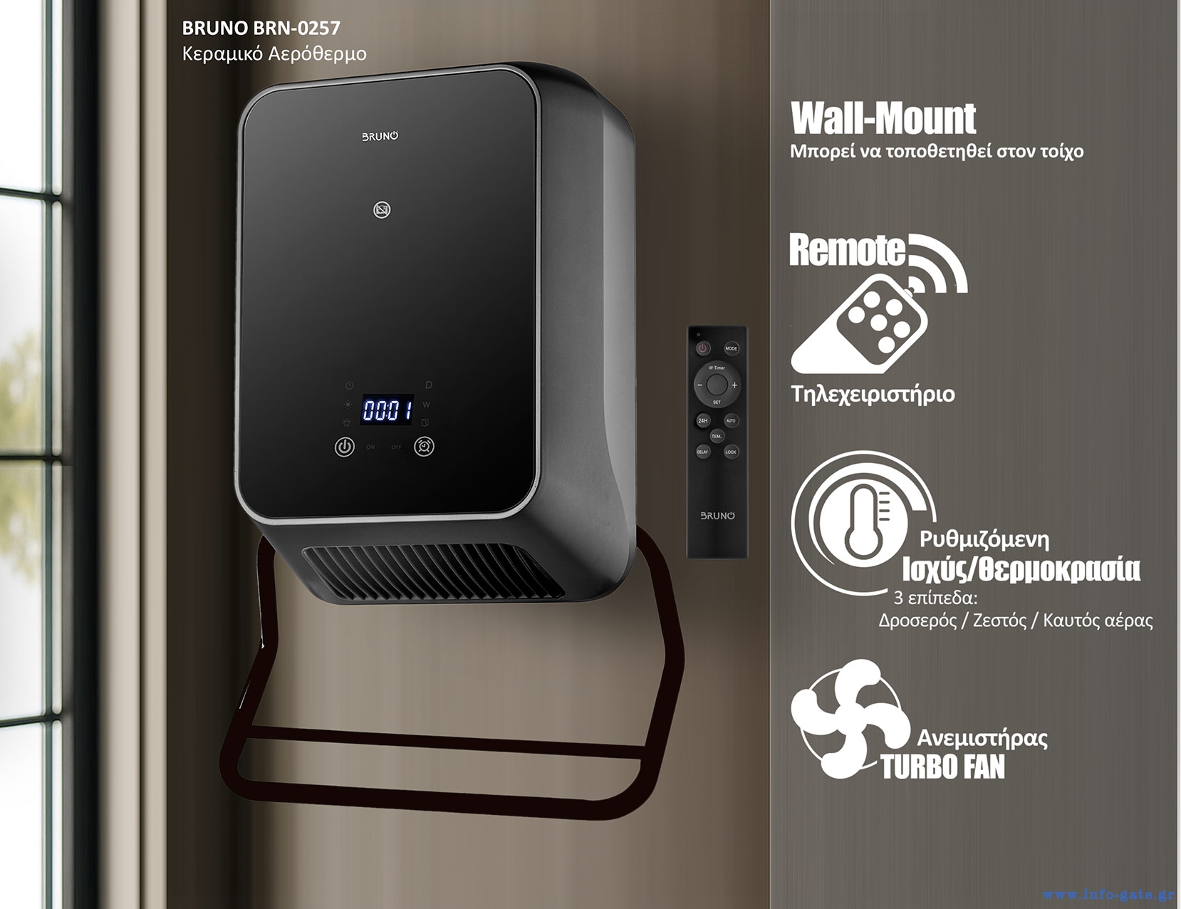 BRUNO BRN-0257 Κεραμικό Αερόθερμο δωματίου & μπάνιου 2000W IP23, προηγμένων λειτουργιών με ανεμιστήρα