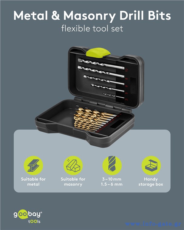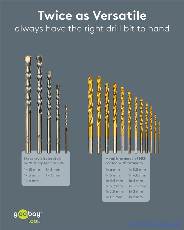 Σετ τρυπάνια της Goobay που αποτελείται από 17 τρυπάνια σε διαφορετικά μεγέθη, κατάλληλα για χρήση σε τοίχους και μεταλλικές επιφάνειες.