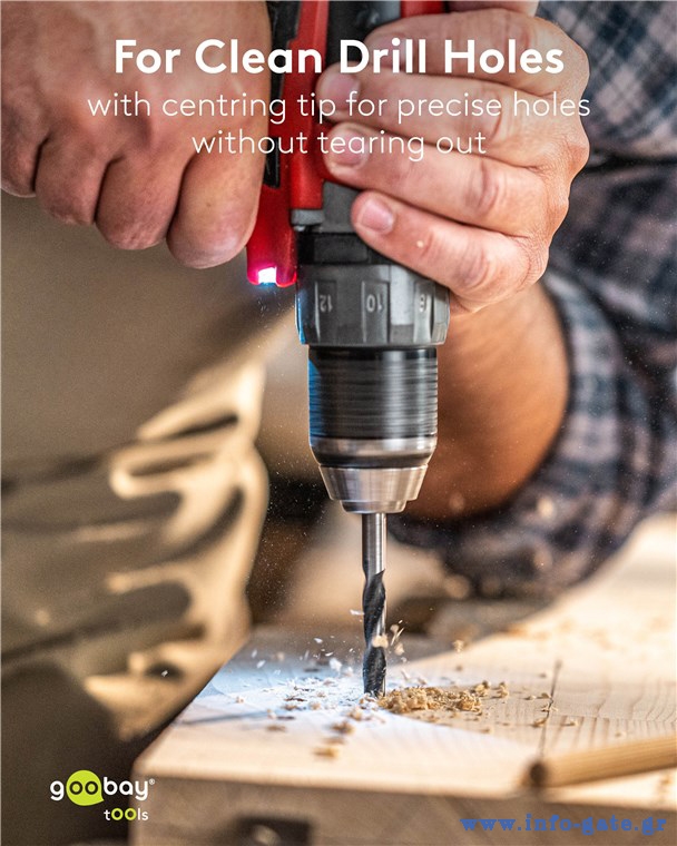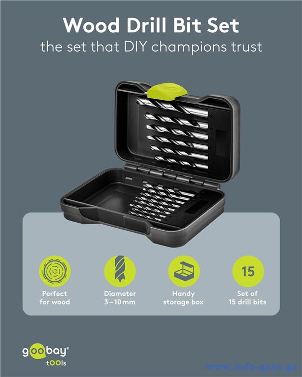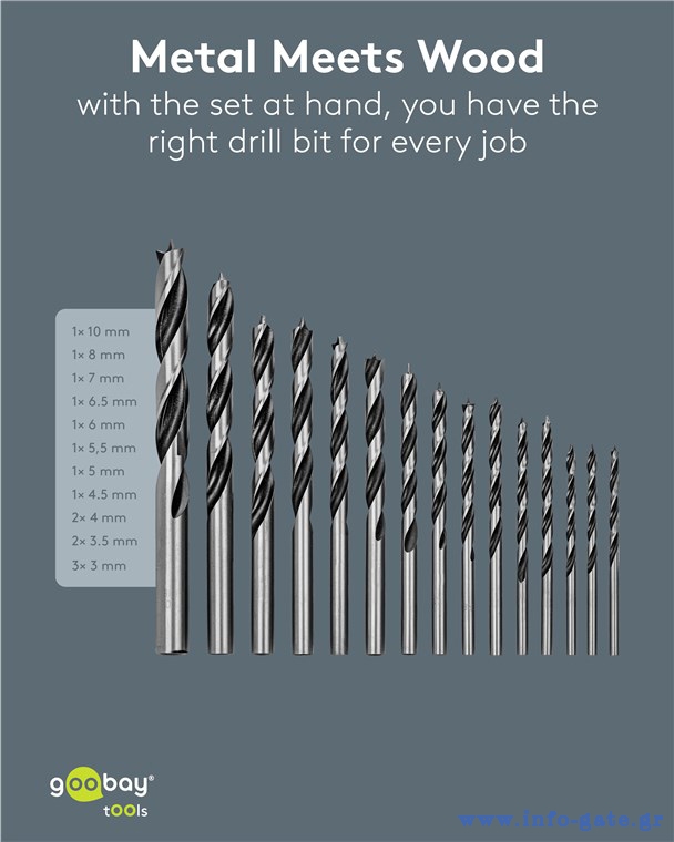 Σετ τρυπάνια της Goobay που αποτελείται από 15 τρυπάνια σε διαφορετικά μεγέθη, κατάλληλα για χρήση σε ξύλινες επιφάνειες.