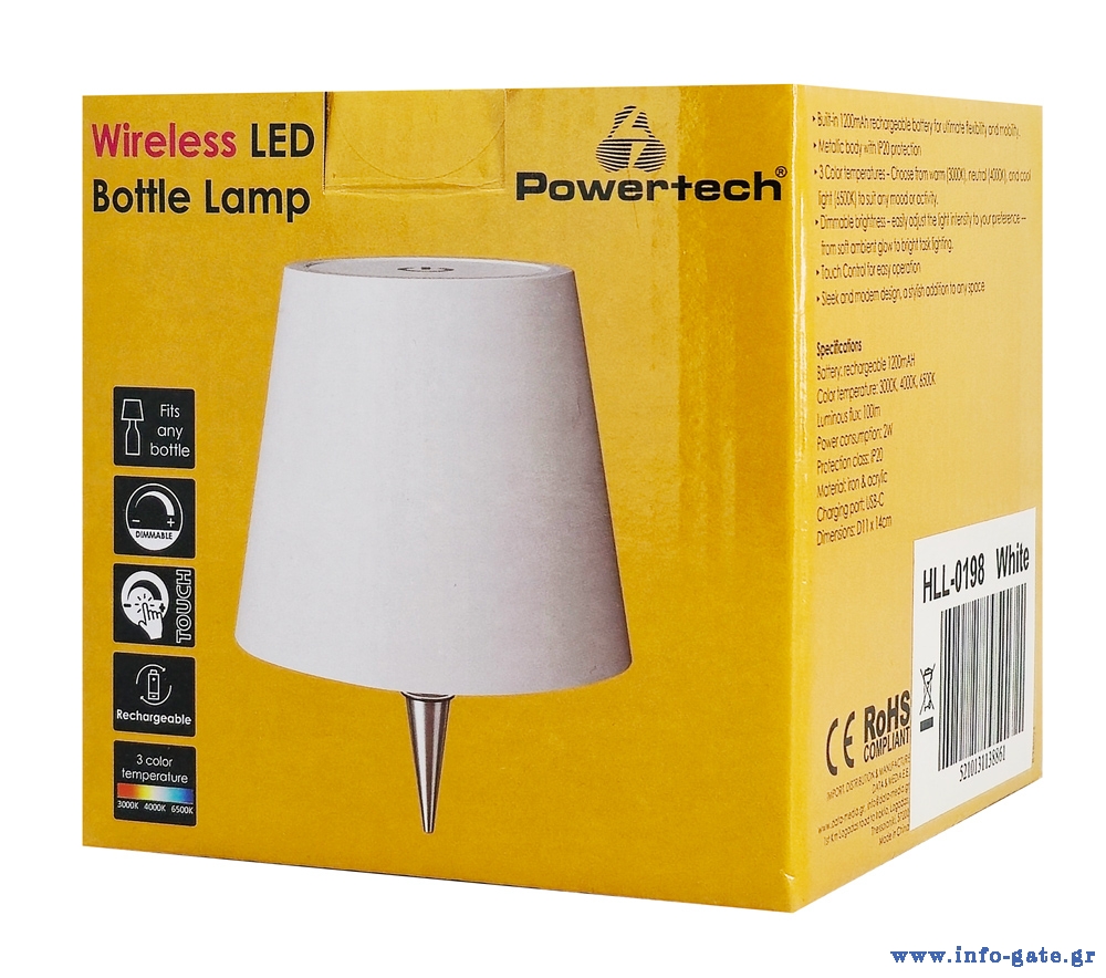 POWERTECH LED φωτιστικό για μπουκάλι HLL-0198, ρυθμιζόμενο, επαναφορτιζόμενο, λευκό