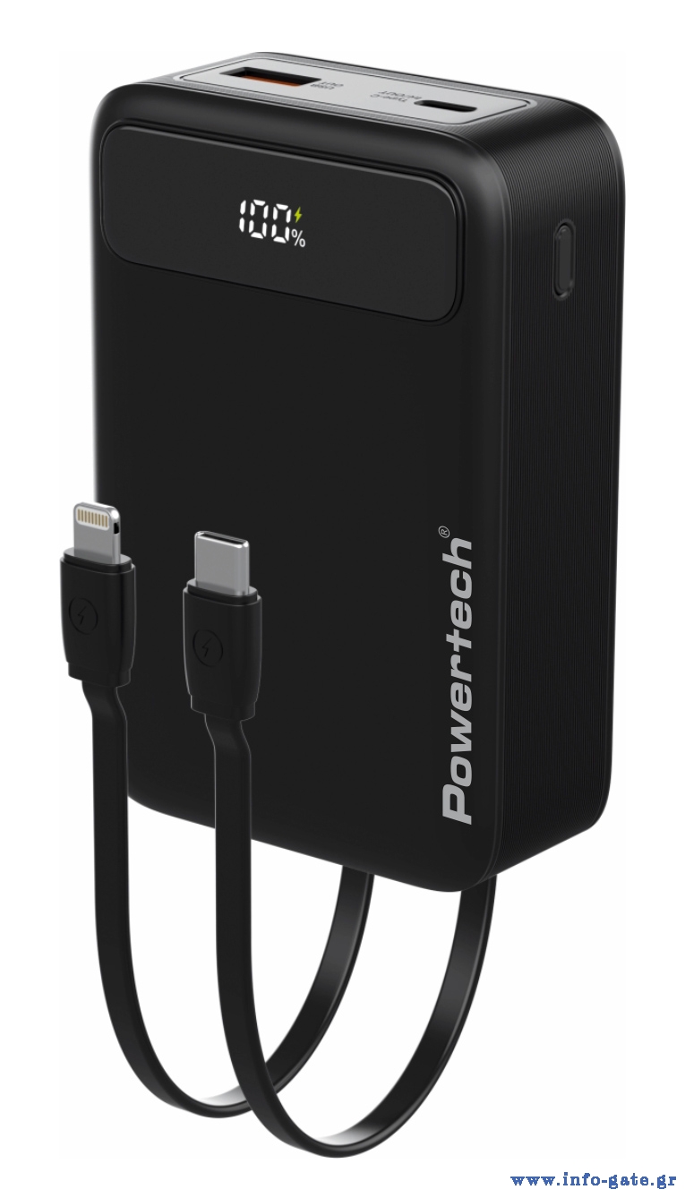 POWERTECH power bank PT-1504 με καλώδια & οθόνη, 20000mah, 22.5W, μαύρο