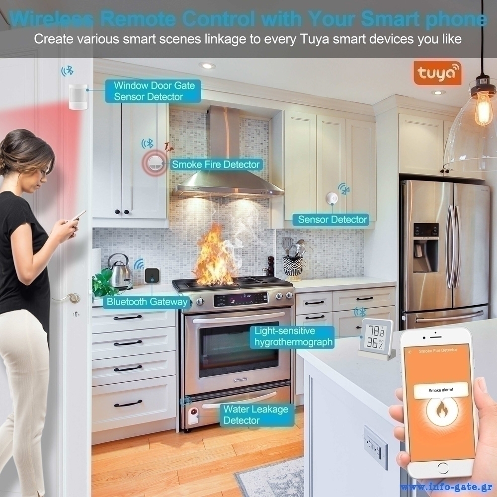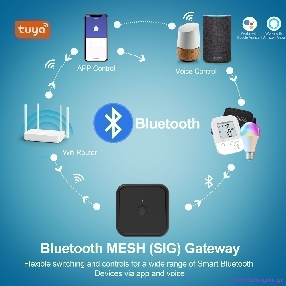 Υποστηρίζει σύνδεση με έως 32 συσκευές, η οποία πραγματοποιείται μέσω Wi-Fi και Bluetooth. Ο απομακρυσμένος έλεγχος των συσκευών γίνεται μέσω smartphone και της εφαρμογής Smart Life ή Tuya Smart.