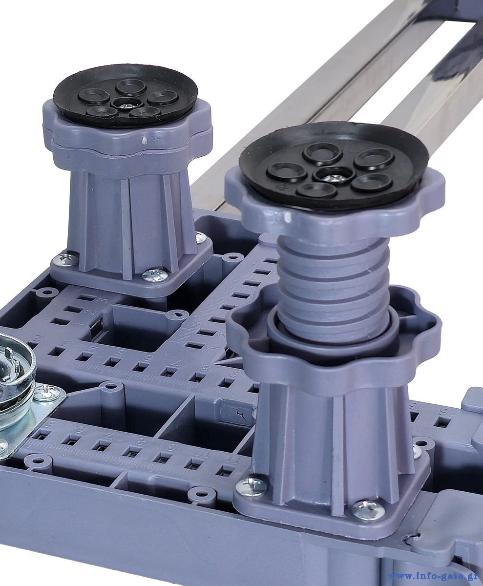 Διαθέτει 4 διπλούς τροχούς με φρένα ακινητοποίησης, 8 ποδαράκια ρυθμιζόμενου ύψους και αλφάδι για την διευκόλυνση της τοποθέτησης των αντικειμένων.