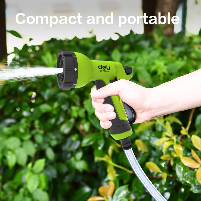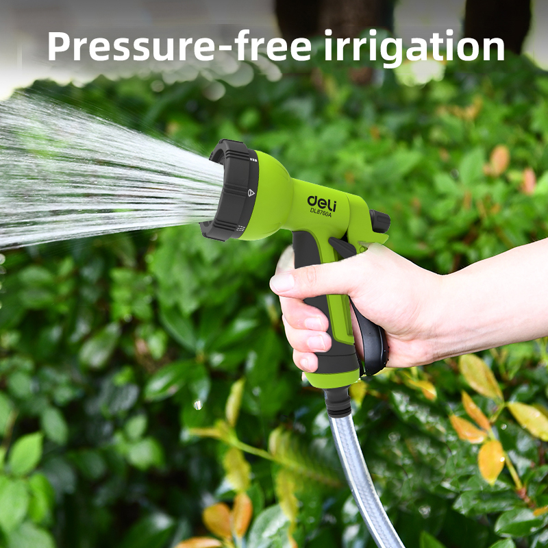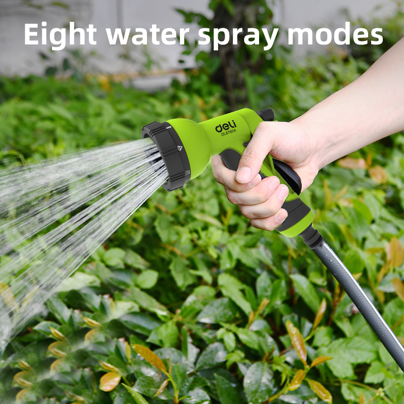 Πιστόλι εκτόξευσης νερού της Deli ιδανικό για εύκολο και αποτελεσματικό πότισμα. Διαθέτει 8 λειτουργίες ψεκασμού, προσφέροντας ευελιξία για διαφορετικές εφαρμογές ενώ η αντιολισθητική λαβή του εφαρμόζει καλά στο χέρι για πιο ξεκούραστο πότισμα.