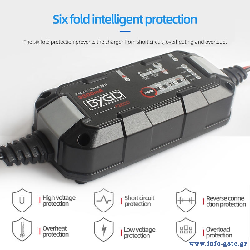 Ο BYGD F3500 είναι ένας αξιόπιστος και έξυπνος φορτιστής–συντηρητής μπαταρίας, ιδανικός για αυτοκίνητα, μοτοσυκλέτες και άλλα οχήματα με μπαταρίες 6V ή 12V.