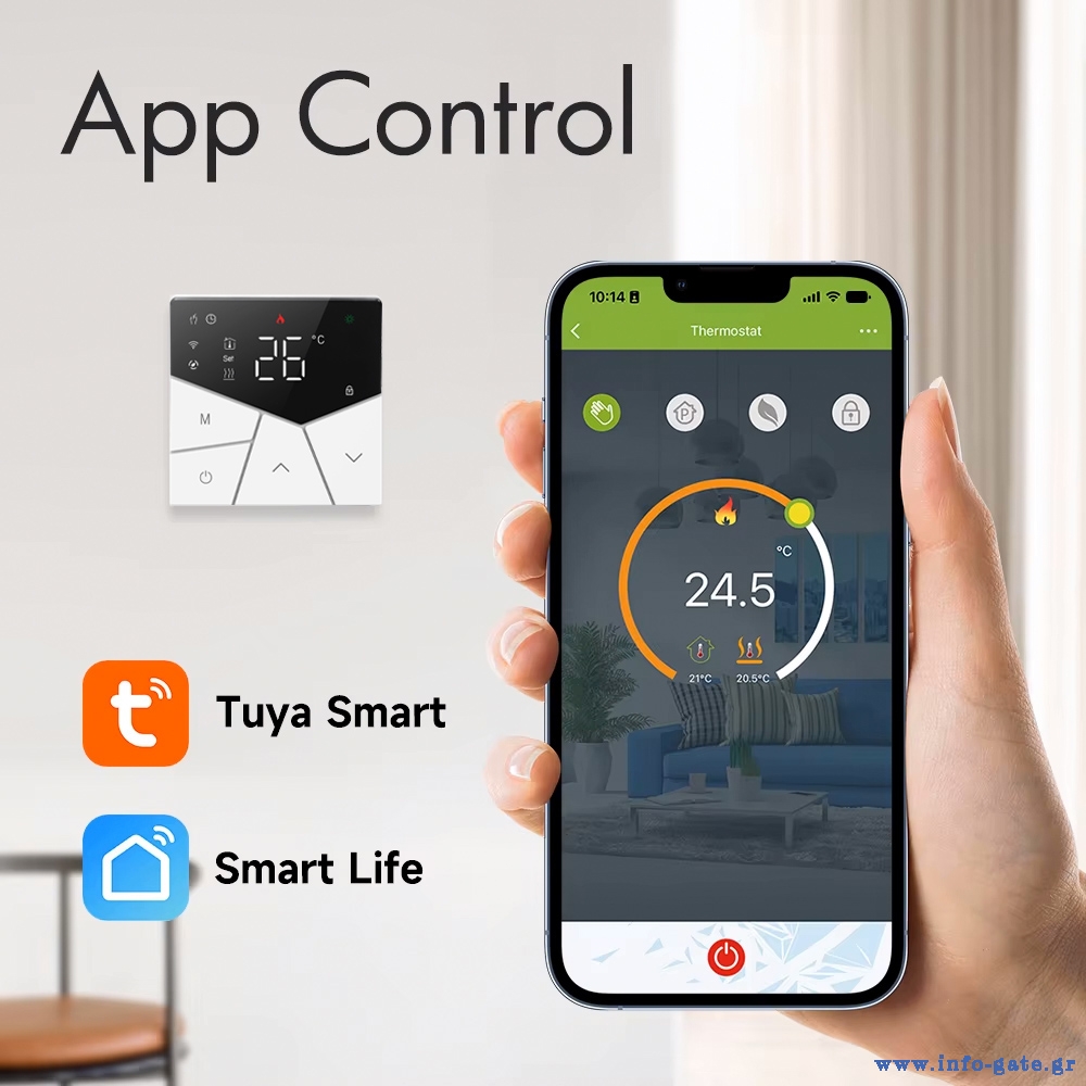 Συνδέεται με smartphone μέσω WiFi και της εφαρμογής Smart Life, επιτρέποντας σας τον απομακρυσμένο έλεγχο του θερμοστάτη από την συσκευή σας.
