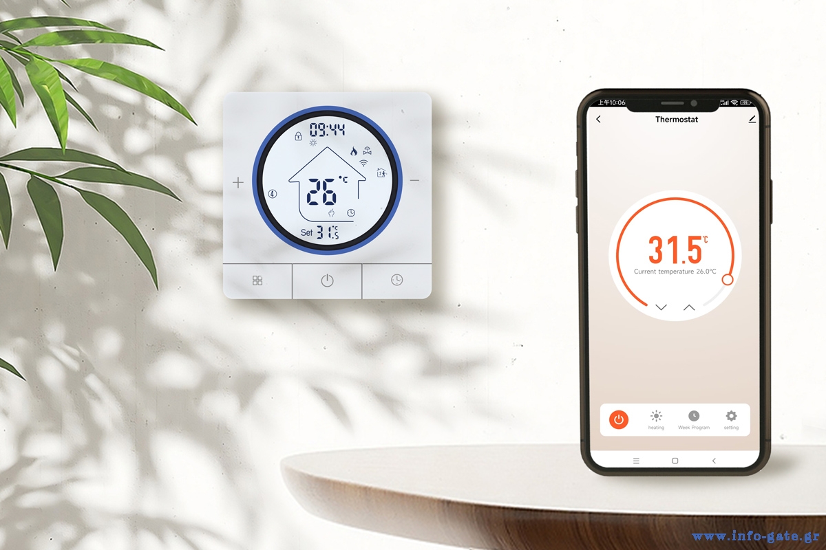 Συνδέεται με smartphone μέσω WiFi και της εφαρμογής Smart Life ή Tuya, επιτρέποντας σας τον απομακρυσμένο έλεγχο του θερμοστάτη από την συσκευή σας.