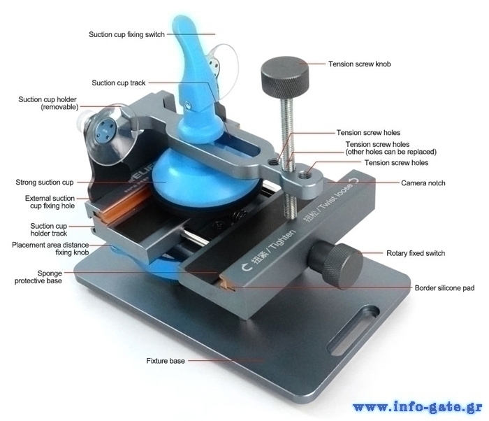 Ο διαχωρισμός της οθόνης γίνεται εύκολα με ισχυρή βεντούζα, χωρίς την χρήση θερμότητας. Η βάση τοποθέτησης του smartphone εξοπλίζεται με αντιολισθητικά pads που αποτρέπουν τις φθορές, ενώ διαθέτει και ειδική σχεδίαση για την προστασία της κάμερας. Το μήκος τοποθέτησης είναι ρυθμιζόμενο επιτρέποντας την τοποθέτηση smartphone διαφόρων μεγεθών.