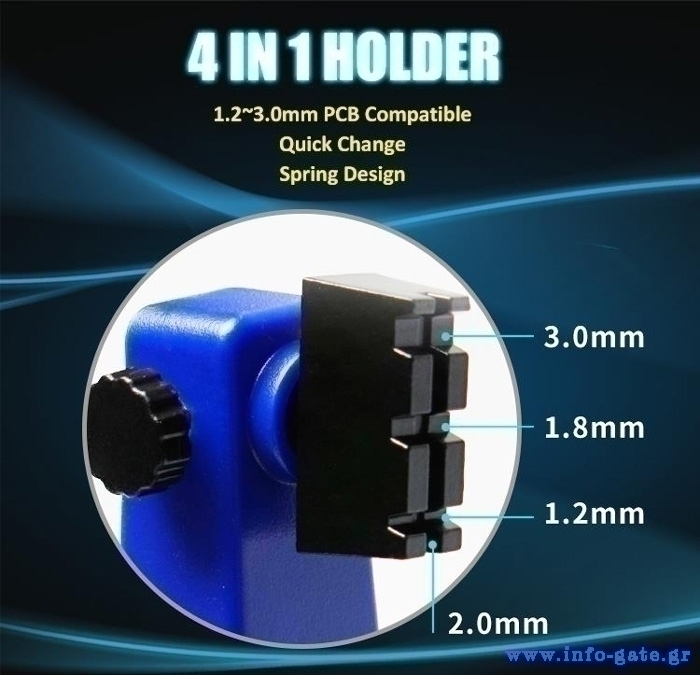 Η βάση της διαθέτει αντιολισθητικά pads, ενώ, οι βραχίονες συγκράτησης είναι περιστρεφόμενοι, προσφέροντας μεγαλύτερη σταθερότητα και ευελιξία κατά την εργασία.