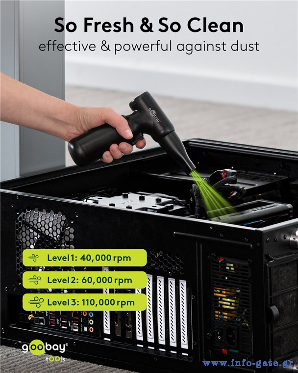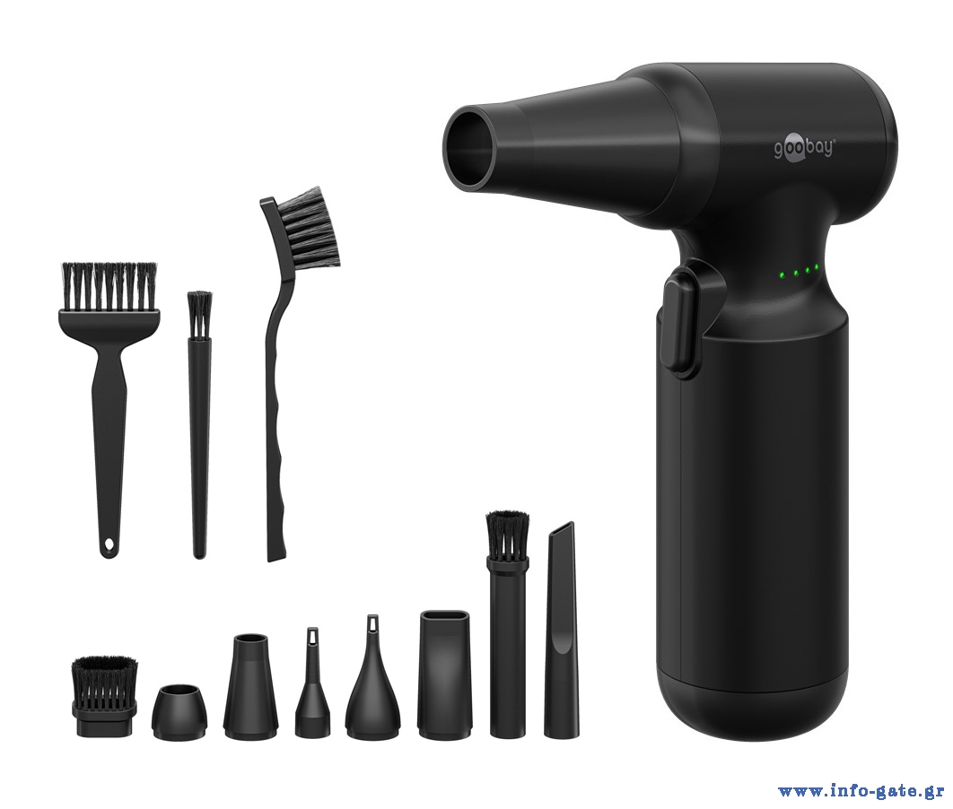 Ηλεκτρικό air duster της Goobay, κατάλληλο για την απομάκρυνση της σκόνης από αξεσουάρ και οικιακά αντικείμενα όπως πληκτρολόγια, PC cases, κλιματιστικά, ηλεκτρονικές συσκευές κ.α.