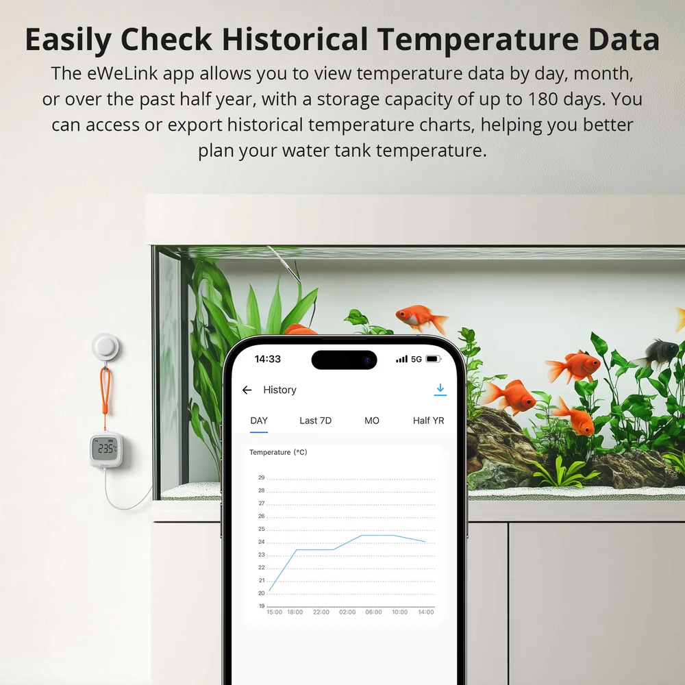 Προβολή δεδομένων θερμοκρασίας μέσω της εφαρμογής eWeLink (ημερήσια, μηνιαία ή έως 6 μήνες) με δυνατότητα εξαγωγής ιστορικών στοιχείων για ανάλυση.
