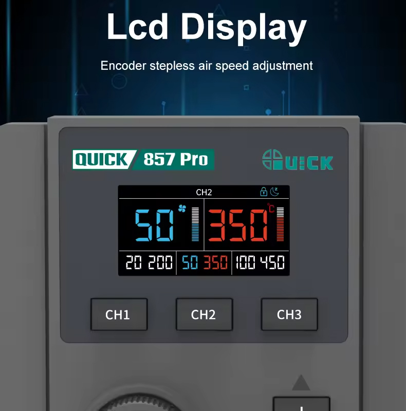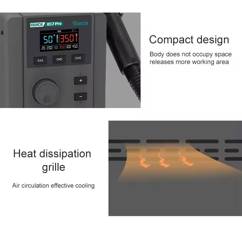 Ο σταθμός θερμού αέρα QUICK857 Pro της QUICK αποτελεί μια εξαιρετική επιλογή για κάθε εργασία που απαιτεί ακρίβεια και απόδοση.
