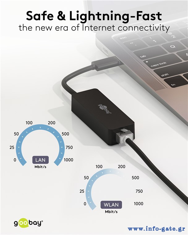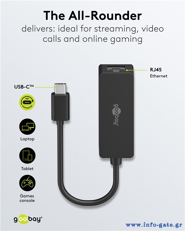 Ο αντάπτορας δικτύου της Goobay συνδέεται στον υπολογιστή ή το laptop σας μέσω θύρας USB-C, επεκτείνοντας τις θύρες του με 1x θύρα RJ45, η οποία επιτρέπει την ενσύρματη σύνδεση στο δίκτυο με ταχύτητες έως 1000Mbps.