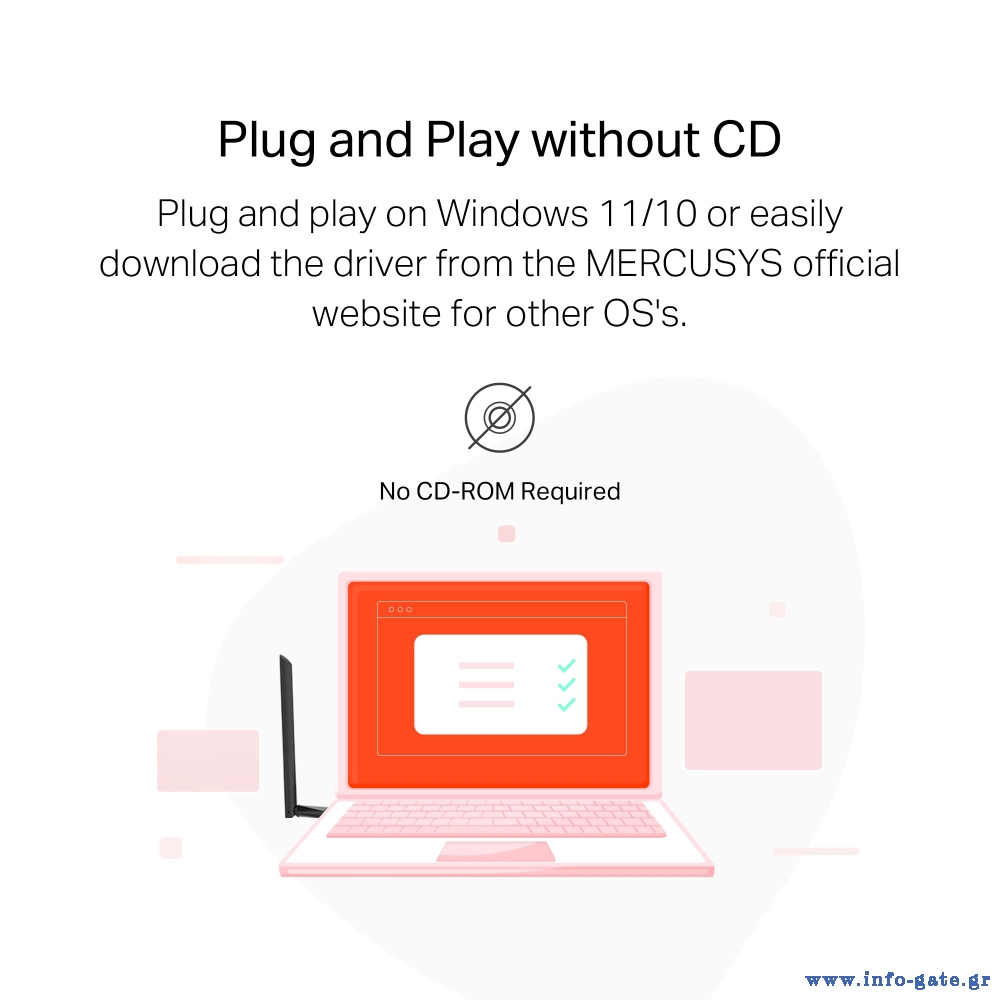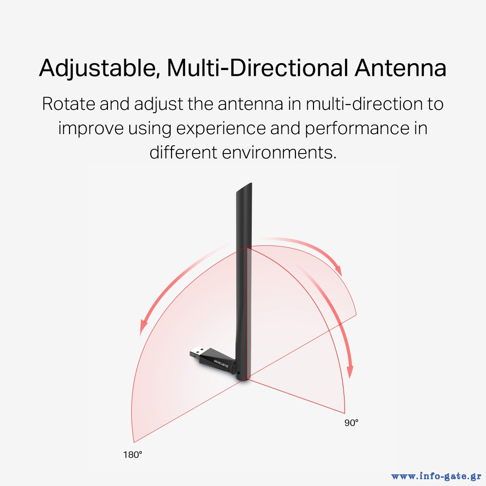 Ο ασύρματος USB αντάπτορας δικτύου MU6H της MERCUSYS σας επιτρέπει να συνδέσετε ένα σταθερό ή φορητό υπολογιστή, σε ασύρματο δίκτυο WiFi, μέσω ελεύθερης θύρας USB.