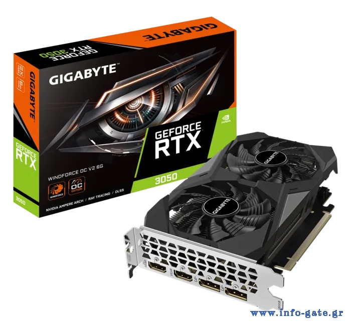 Η GV-N3050WF2OCV2-6GD της GIGABYTE είναι μια gaming κάρτα γραφικών η οποία βασίζεται στο δημοφιλές chip GeForce RTX 3050 της NVIDIA. Εξοπλίζεται από ολοκληρωμένο και αποδοτικό σύστημα ψύξης δύο ανεμιστήρων, το οποίο φροντίζει για την χαμηλή θερμοκρασία της κάρτας. Διαθέτει 4 εξόδους: 2x DisplayPort & 2x HDMI.