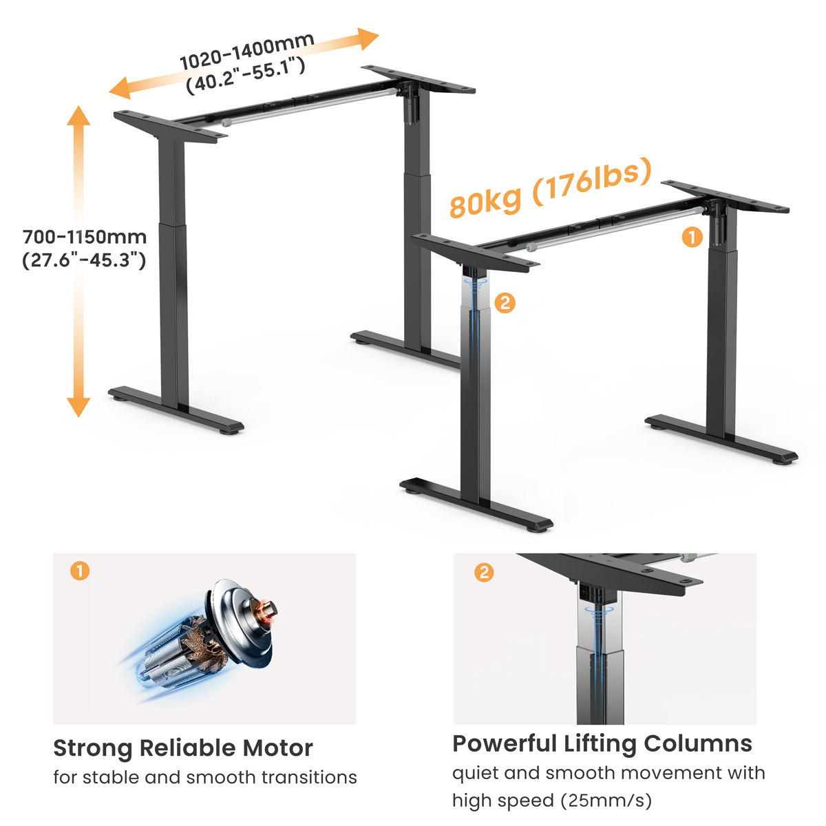 BRATECK σκελετός ηλεκτρικού γραφείου S22-22D, 1020~1400x600x700~1150mm, μαύρο