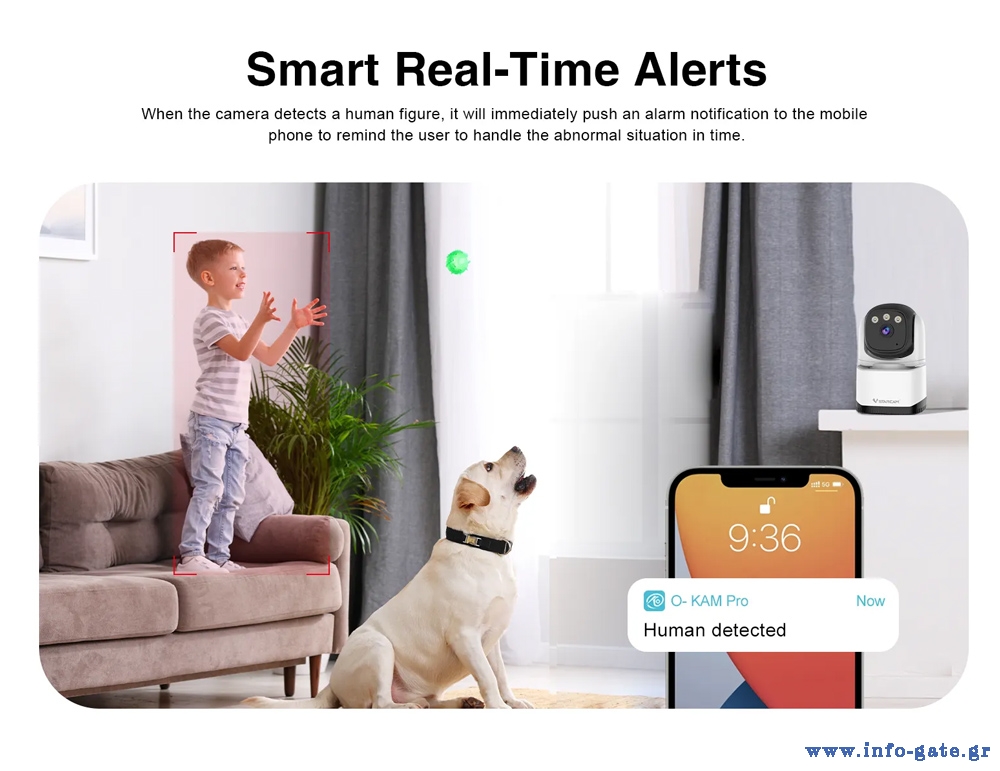 Μπορεί να ανιχνεύσει κινήσεις, στέλνοντας ειδοποιήσεις στο smartphone σας κάθε φορά που ανιχνεύεται κίνηση και εξοπλίζεται με υψηλής ποιότητας μικρόφωνο που επιτρέπει την αμφίδρομη μεταφορά φωνής και ήχου.