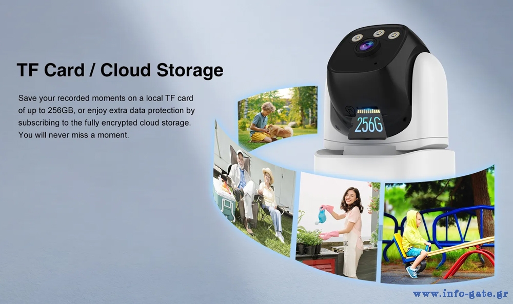 Η αποθήκευση των αρχείων γίνεται σε λογαριασμό στο cloud ή σε κάρτα μνήμης micro SD (δεν συμπεριλαμβάνεται).