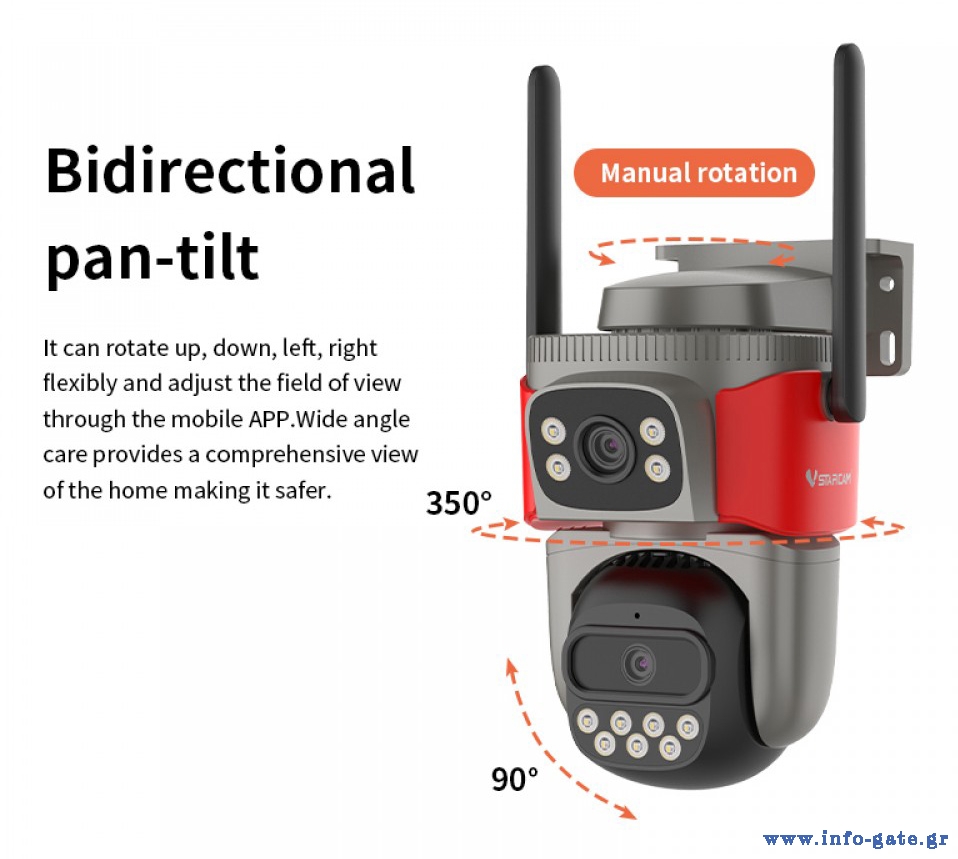 Ενσωματώνει 2 φακούς που επιτρέπουν μεγαλύτερη κάλυψη στον χώρο και υποστηρίζει PTZ λειτουργία που σας επιτρέπει την οριζόντια και κάθετη μετακίνηση της κάμερας μέσω της εφαρμογής.