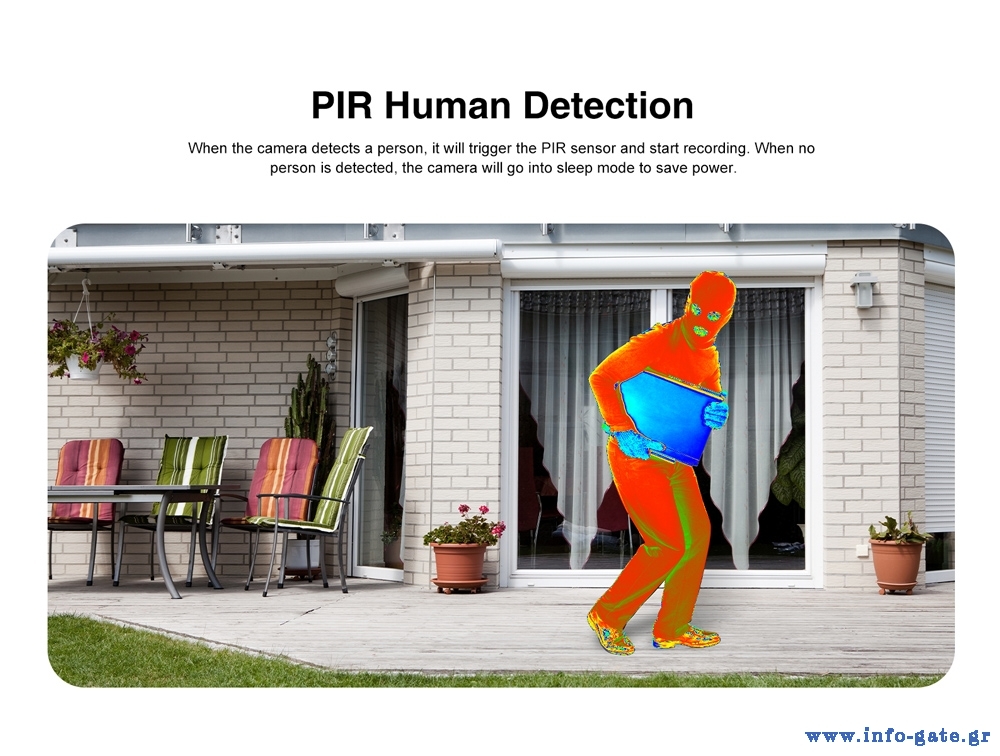 Μπορεί να ανιχνεύσει την ανθρώπινη σιλουέτα και κίνηση, στέλνοντας ειδοποιήσεις στο smartphone σας κάθε φορά που ανιχνεύεται κίνηση αλλά και να ενεργοποιήσει ηχητικό και οπτικό (με φως) συναγερμό.