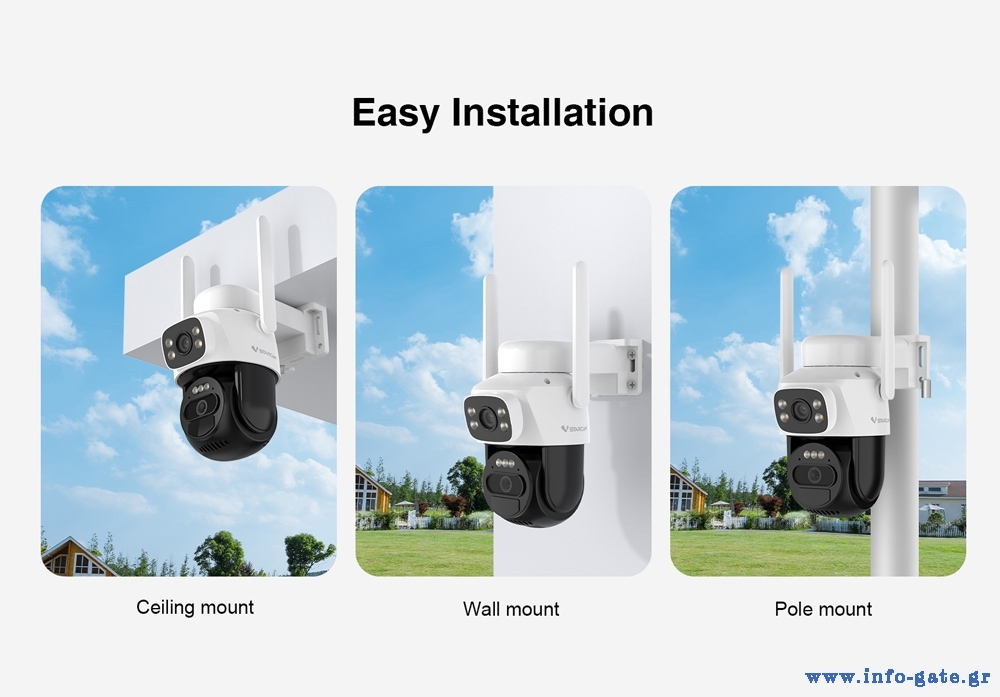 Ενσωματώνει 2 φακούς που επιτρέπουν μεγαλύτερη κάλυψη στον χώρο και υποστηρίζει PTZ λειτουργία που σας επιτρέπει την οριζόντια και κάθετη μετακίνηση της κάμερας μέσω της εφαρμογής.