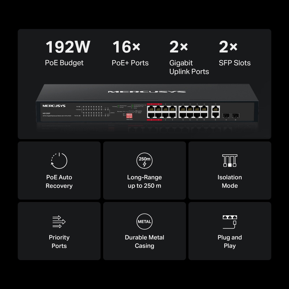 Το rackmount switch της Mercusys σας επιτρέπει να επεκτείνετε το ενσύρματο δίκτυο σας με 16x Gigabit PoE+ θύρες, 2x Gigabit χωρίς PoE θύρες και 2x SFP υποδοχές.