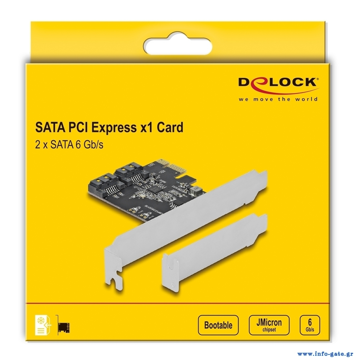 Η κάρτα επέκτασης PCI express από τη Delock επεκτείνει το desktop με 2 εσωτερικές θύρες SATA. Διαφορετικές συσκευές όπως δίσκοι SSD, σκληροί δίσκοι, δίσκοι DVD κ.λπ. μπορούν να συνδεθούν στην κάρτα.