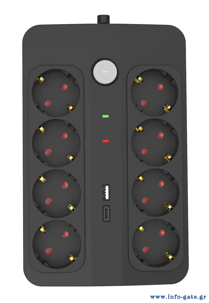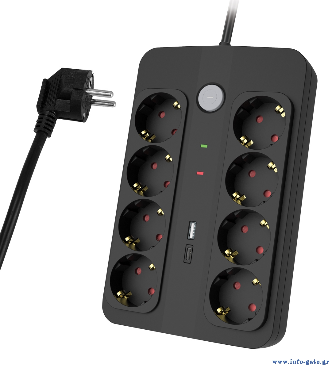 Προστασία από αιφνίδιες αυξομειώσεις τάσης και υπερτάσεις ρεύματος, όπως αυτές που προκαλούνται από κεραυνούς ή προβλήματα του δικτύου. Εξασφαλίζει μεγαλύτερη διάρκεια ζωής και ασφαλή λειτουργία των ηλεκτρονικών σας συσκευών.