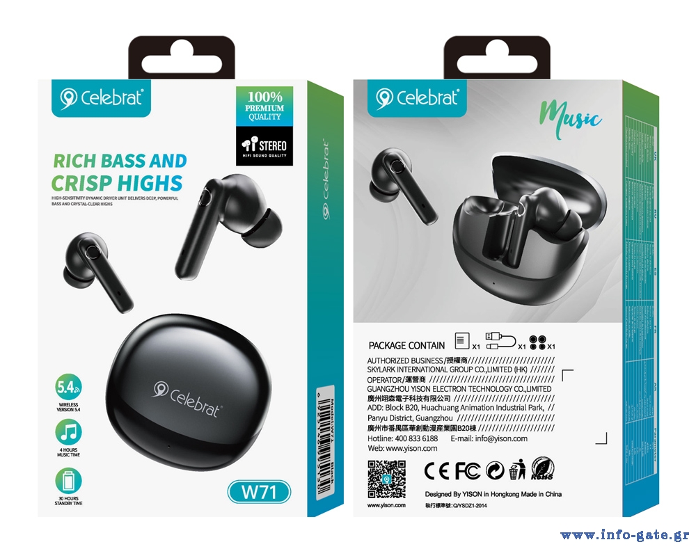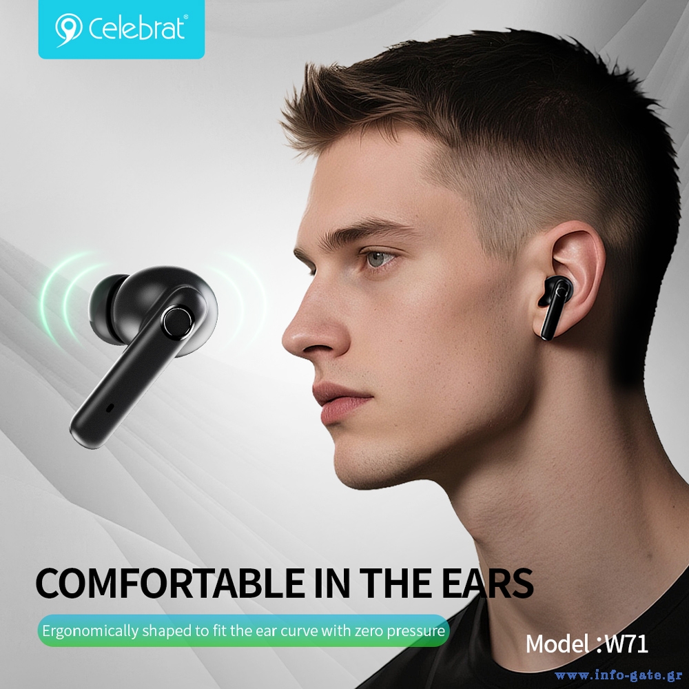 Τα true wireless earphones W71 της Celebrat προσφέρουν κορυφαία ποιότητα ήχου και άριστη εφαρμογή στο αυτί. Είναι συμβατά με tablets, smartphones και άλλες συσκευές που διαθέτουν Bluetooth.