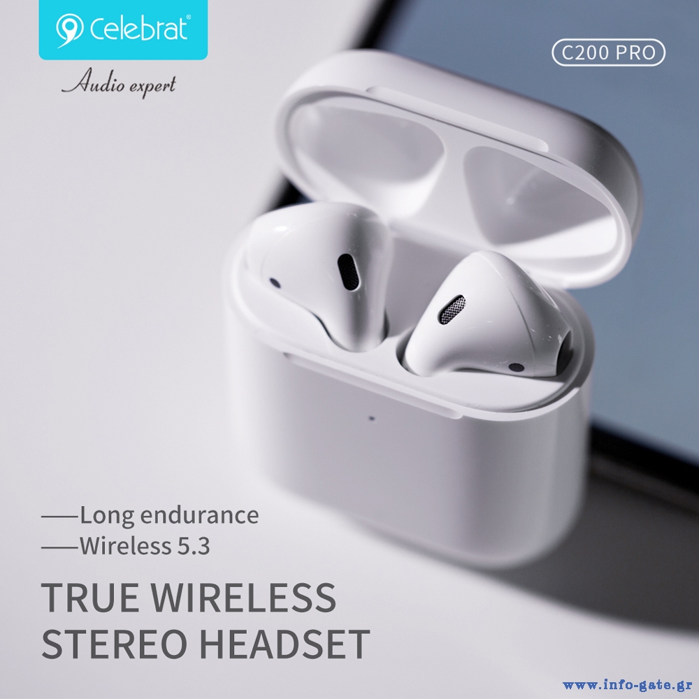 Τα true wireless earphones C200 Pro της Celebrat προσφέρουν κορυφαία ποιότητα ήχου και άριστη εφαρμογή στο αυτί. Είναι συμβατά με tablets, smartphones και άλλες συσκευές που διαθέτουν Bluetooth.