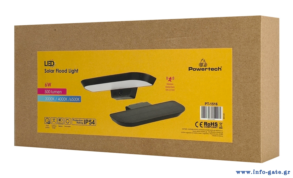 POWERTECH LED ηλιακό φωτιστικό PT-1516 με αισθητήρα κίνησης, 6W, 2000mAh, μαύρο