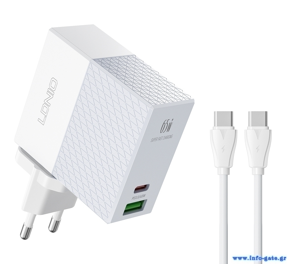 LDNIO φορτιστής τοίχου A2620C με καλώδιο, USB & USB-C, 65W PD, λευκός