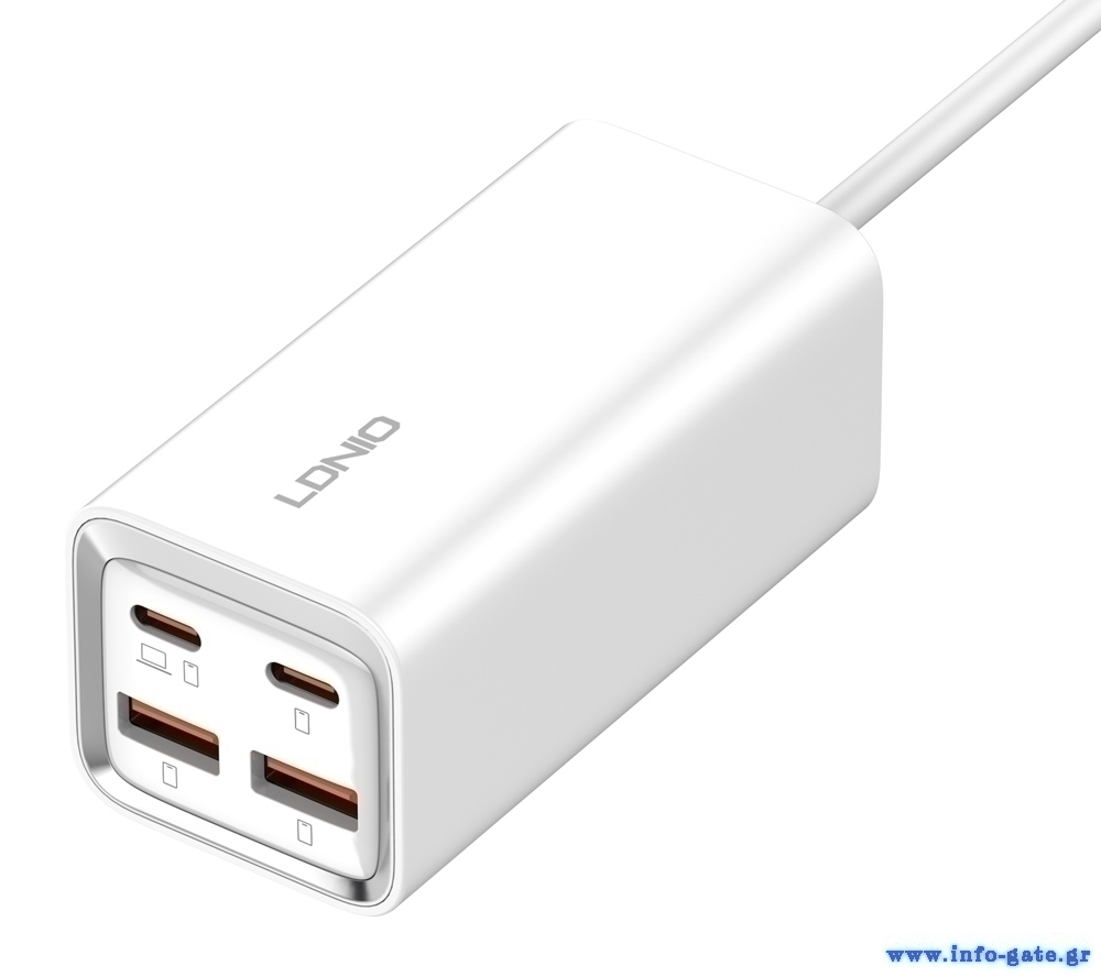LDNIO σταθμός φόρτισης A4610C, 2x USB-C & 2x USB, 65W, PD/QC, λευκός