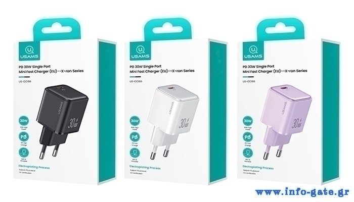 USAMS φορτιστής τοίχου US-CC186, USB-C θύρα εξόδου, 30W PD, μωβ