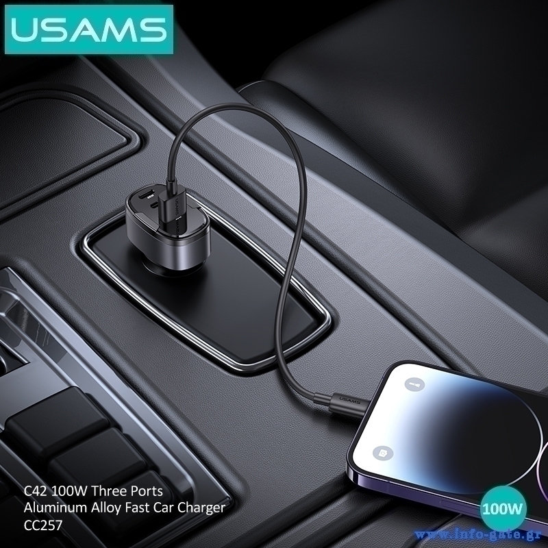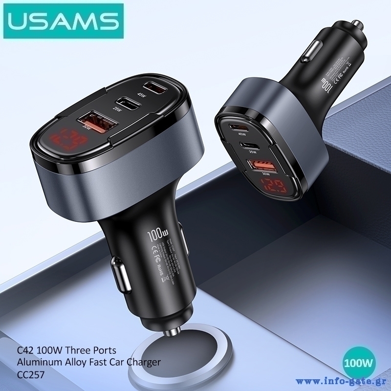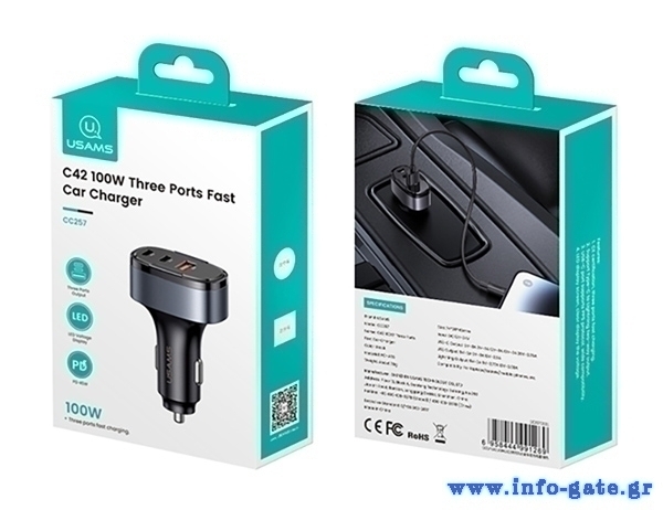 USAMS φορτιστής αυτοκινήτου US-CC257, USB/USB-C/Lightning, 100W, γκρι