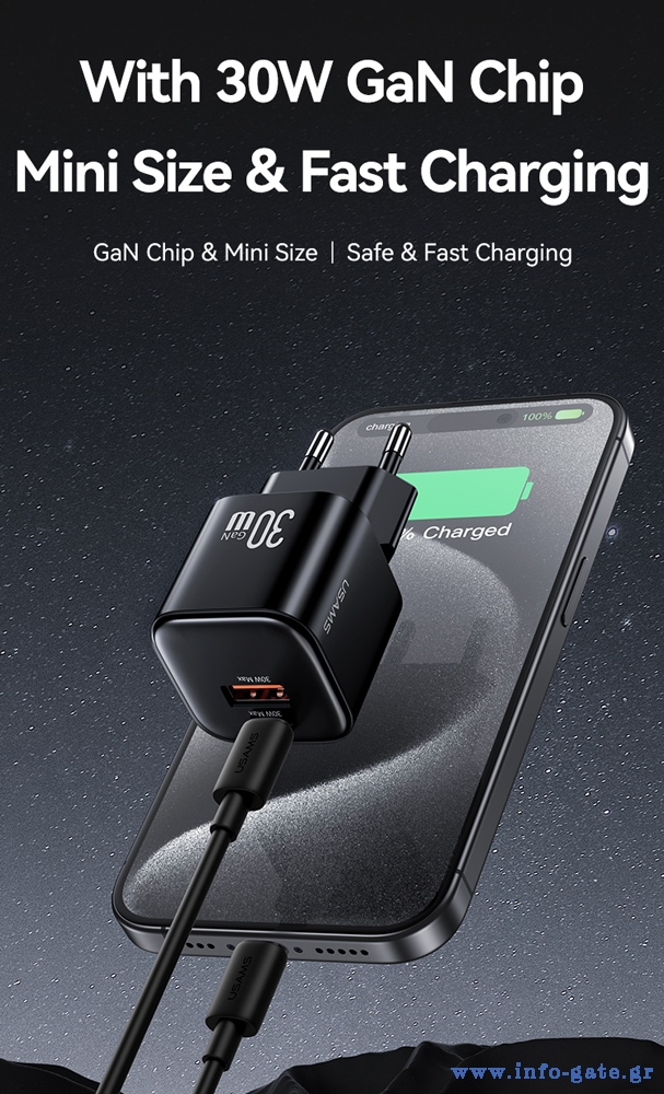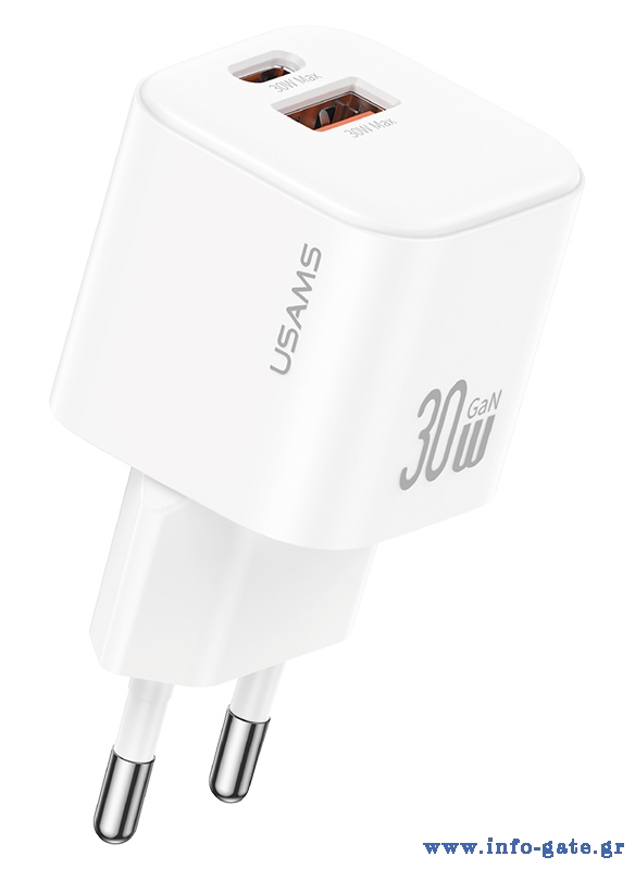 USAMS φορτιστής τοίχου CC263, USB & USB-C, 30W, GaN, λευκός