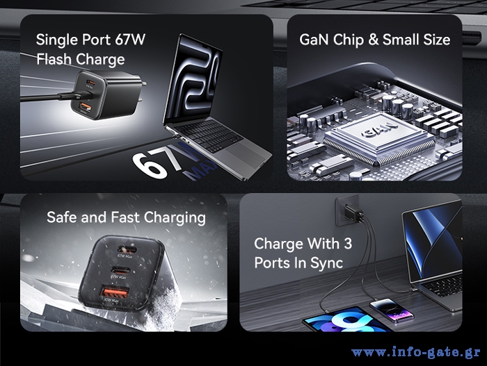 Διαθέτει 1x USB και 2x USB-C θύρες εξόδου που υποστηρίζουν φόρτιση με απόδοση έως 67W.