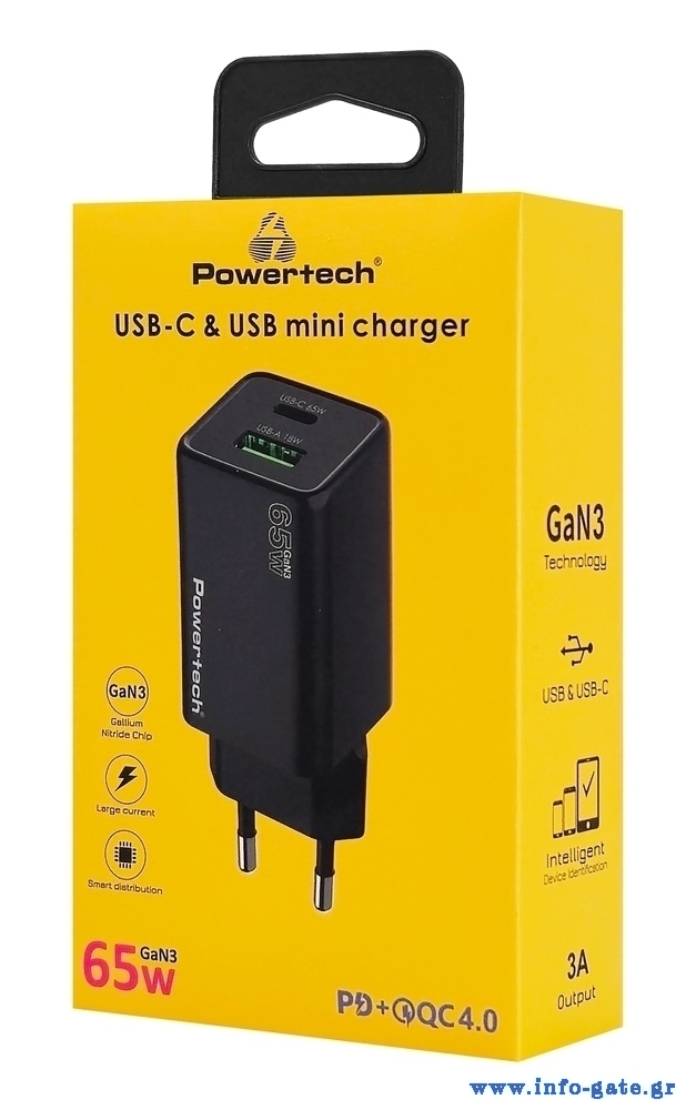 Υψηλής απόδοσης φορτιστής τοίχου της Powertech, κατασκευασμένος από ανθεκτικό υλικό και συμβατός με συσκευές που φορτίζουν μέσω θύρας USB. Διαθέτει USB και USB-C θύρες εξόδου που υποστηρίζουν φόρτιση με μέγιστη απόδοση 65W.