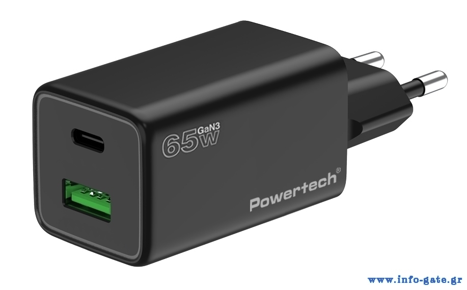 POWERTECH φορτιστής τοίχου PT-1501, USB/USB-C, 65W, GaN, μαύρος