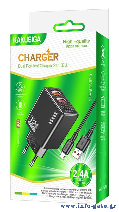 Υψηλής απόδοσης φορτιστής τοίχου της KAKUSIGA, κατασκευασμένος από ανθεκτικό υλικό και συμβατός με συσκευές που φορτίζουν μέσω θύρας USB.