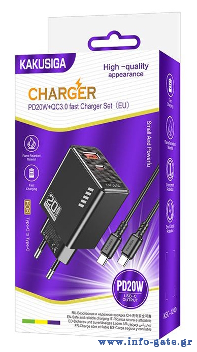 KAKUSIGA φορτιστής τοίχου KSC-1240 με καλώδιο USB-C, USB & USB-C, 20W, μαύρος