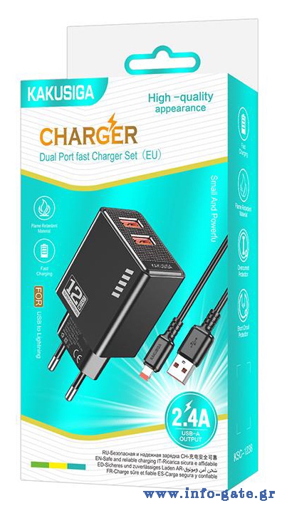 KAKUSIGA φορτιστής τοίχου KSC-1238 με καλώδιο Lightning, 2x USB, 12W, μαύρος