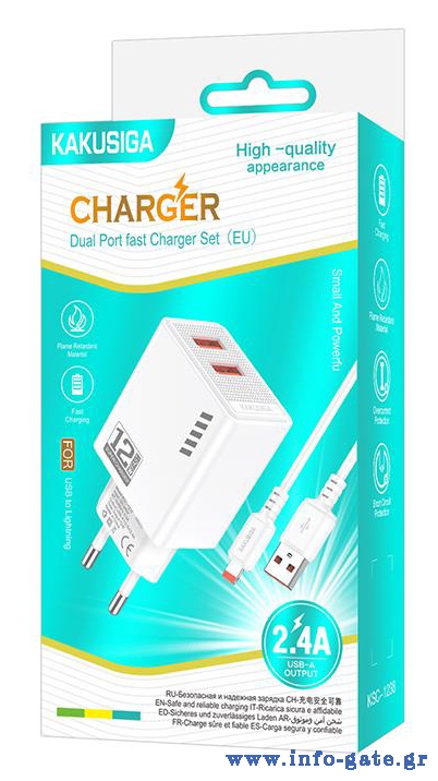 KAKUSIGA φορτιστής τοίχου KSC-1238 με καλώδιο Lightning, 2x USB, 12W, λευκός