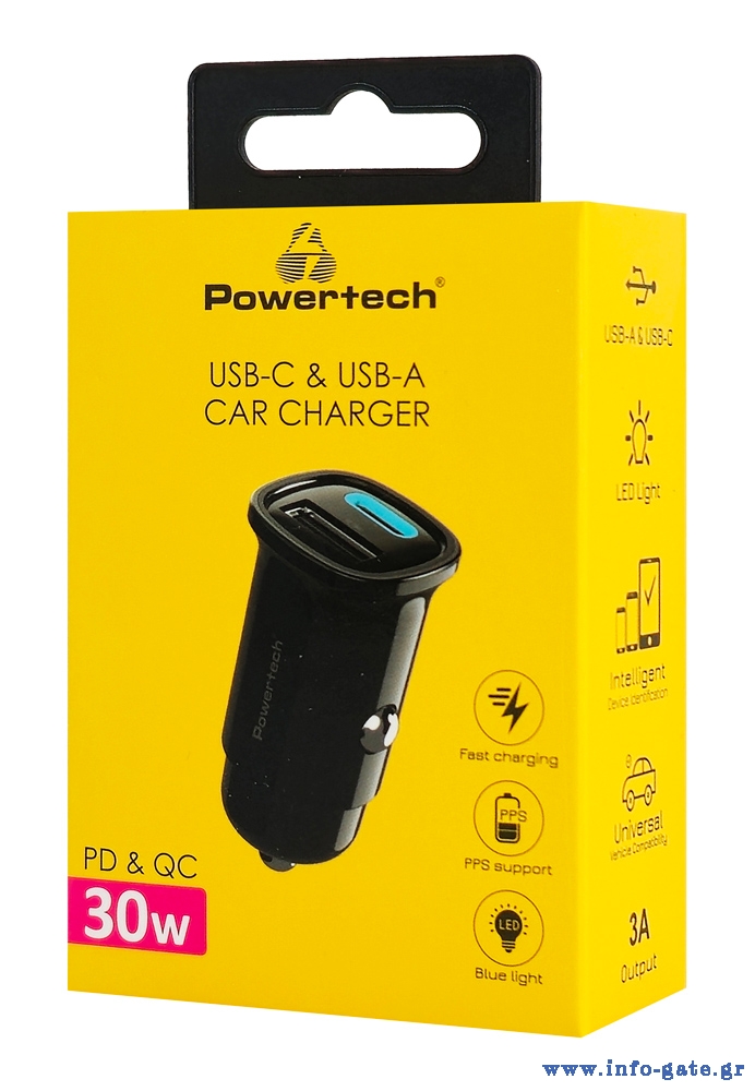 Υψηλής απόδοσης φορτιστής αυτοκινήτου της Powertech, συμβατός με συσκευές που φορτίζουν μέσω θύρας USB. Διαθέτει USB και USB-C θύρες εξόδου που υποστηρίζουν φόρτιση με μέγιστη συνολική απόδοση 30W.