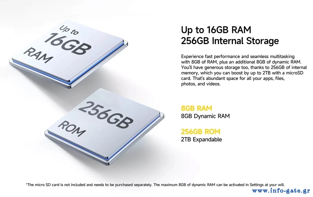 Εξοπλίζεται με μεγάλη οθόνη 5.99", οκταπύρηνο επεξεργαστή, 8GB (+8GB virtual) μνήμη RAM και 256GB αποθηκευτικό χώρο, με δυνατότητα επέκτασης έως 2TB με κάρτα μνήμης micro SD (δεν συμπεριλαμβάνεται).