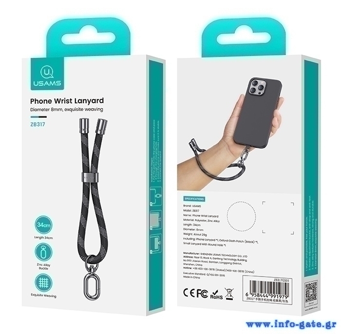 USAMS κορδόνι καρπού για κινητά ZB317, 34cm, universal, μαύρο