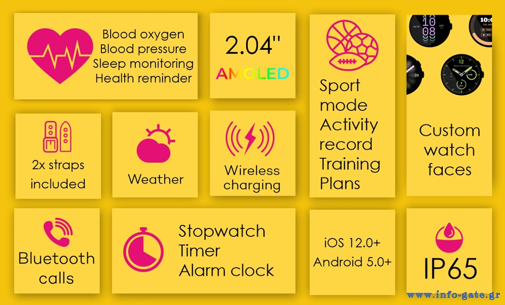 Διαθέτει πληθώρα fitness χαρακτηριστικών και αισθητήρα καρδιακών παλμών. Επιπλέον, υποστηρίζει τηλεφωνικές κλήσεις μέσω Bluetooth, απευθείας από το smartwatch.