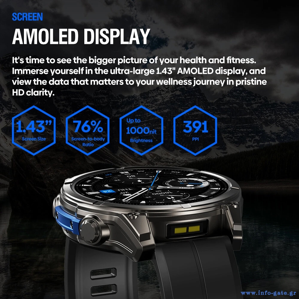 Κομψό smartwatch από την Zeblaze με εξαιρετικά ανθεκτική κατασκευή και εντυπωσιακή έγχρωμη οθόνη αφής 1.43" AMOLED που προσφέρει την δυνατότητα να έχετε την οθόνη του smartwatch πάντα ενεργοποιημένη.