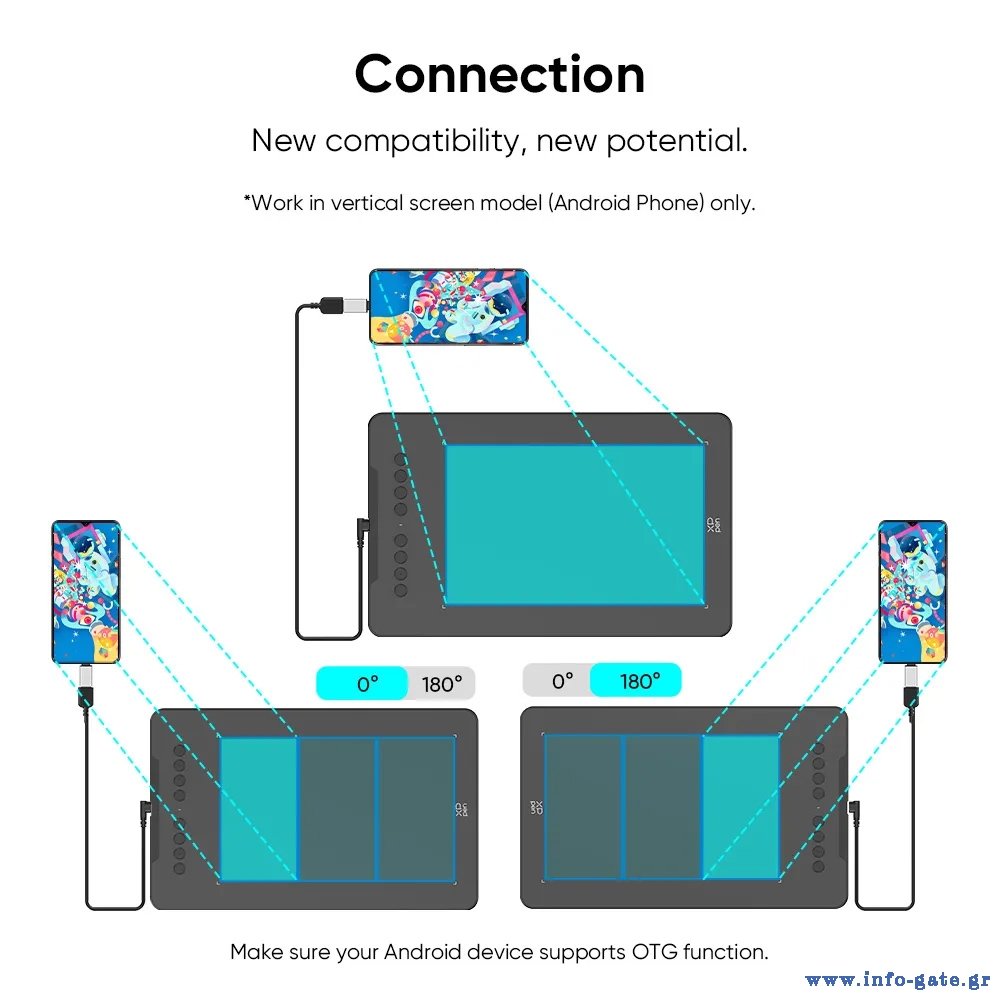 Η σύνδεση του με desktop, laptop, tablet ή smartphone γίνεται μέσω καλωδίου USB, ενώ, στη συσκευασία συμπεριλαμβάνεται γραφίδα η οποία λειτουργεί χωρίς μπαταρία.