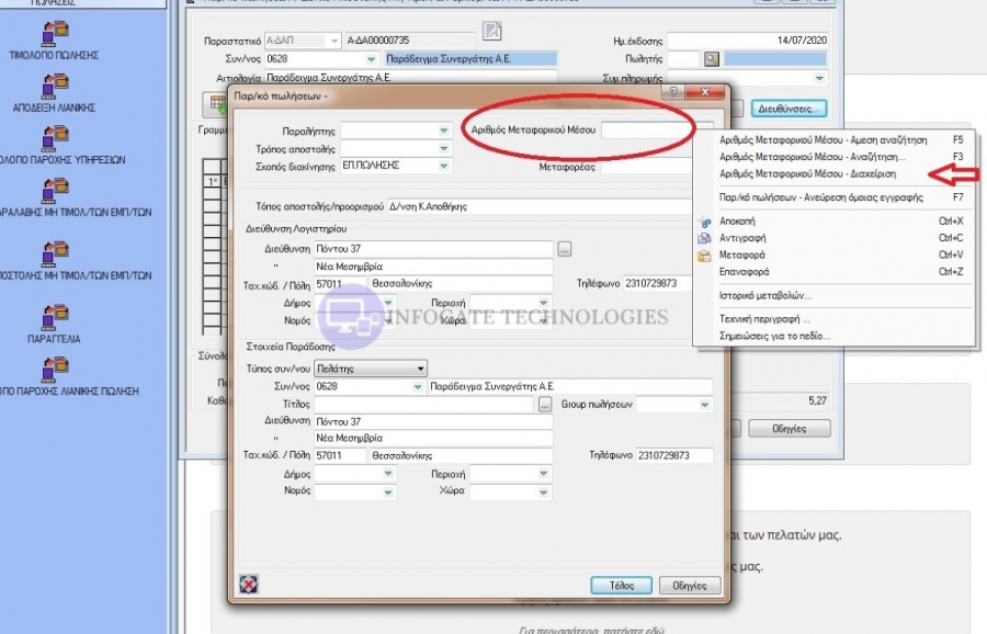 Στο παράθυρο που θα ανοίξει μετακινούμαστε το πεδίο "Αριθμός Μεταφορικού Μέσου" και κάνουμε δεξί κλικ ώστε να επιλέξουμε "Διαχείριση"